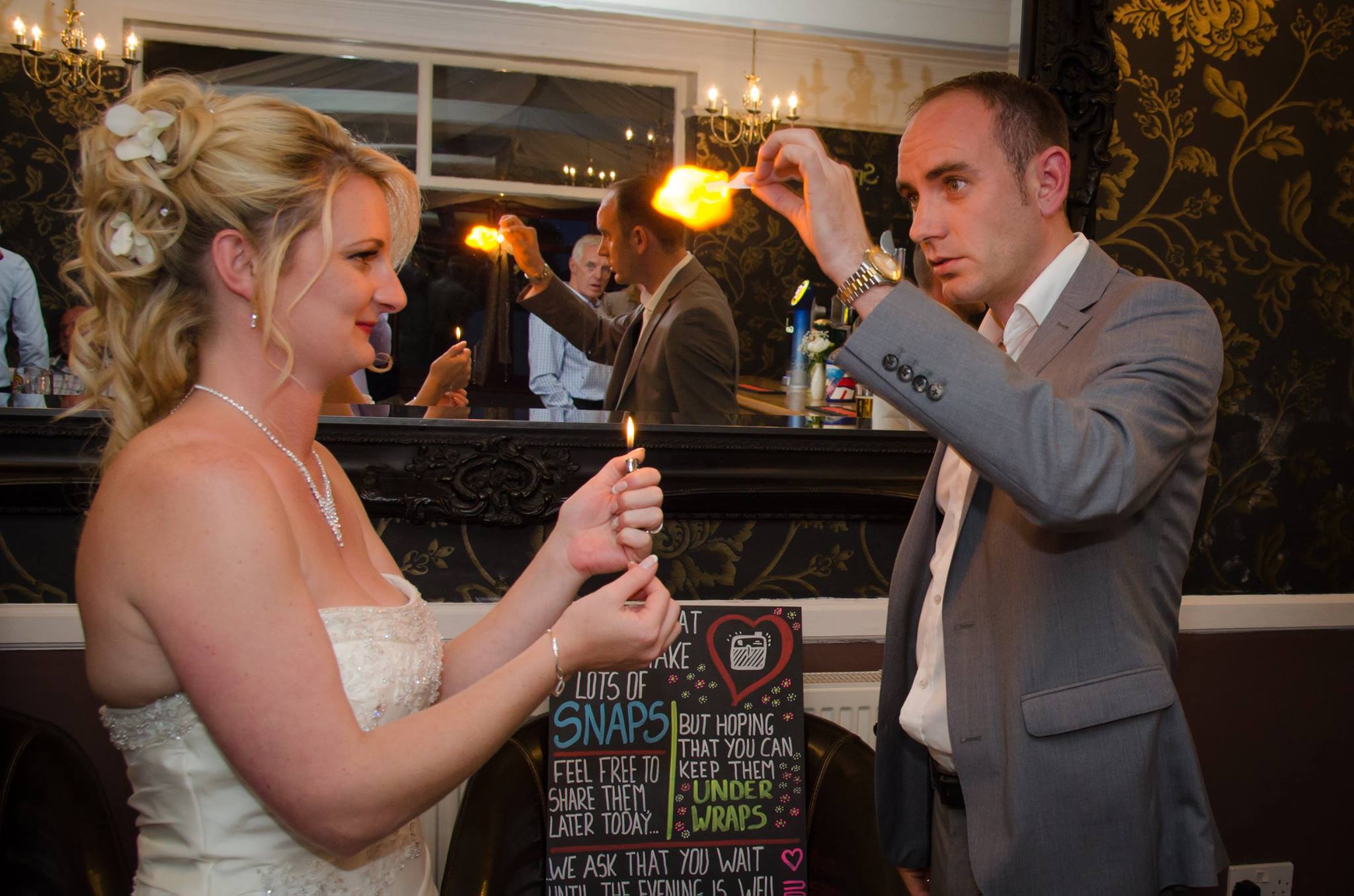 •  Close-up magic to be performed during reception drinks, to keep the guests entertained. This normally helps while the bride and groom are having their photographs taken. This can sometimes take some time, so can be a good ice-breaker and entertainment for the guests while they wait.